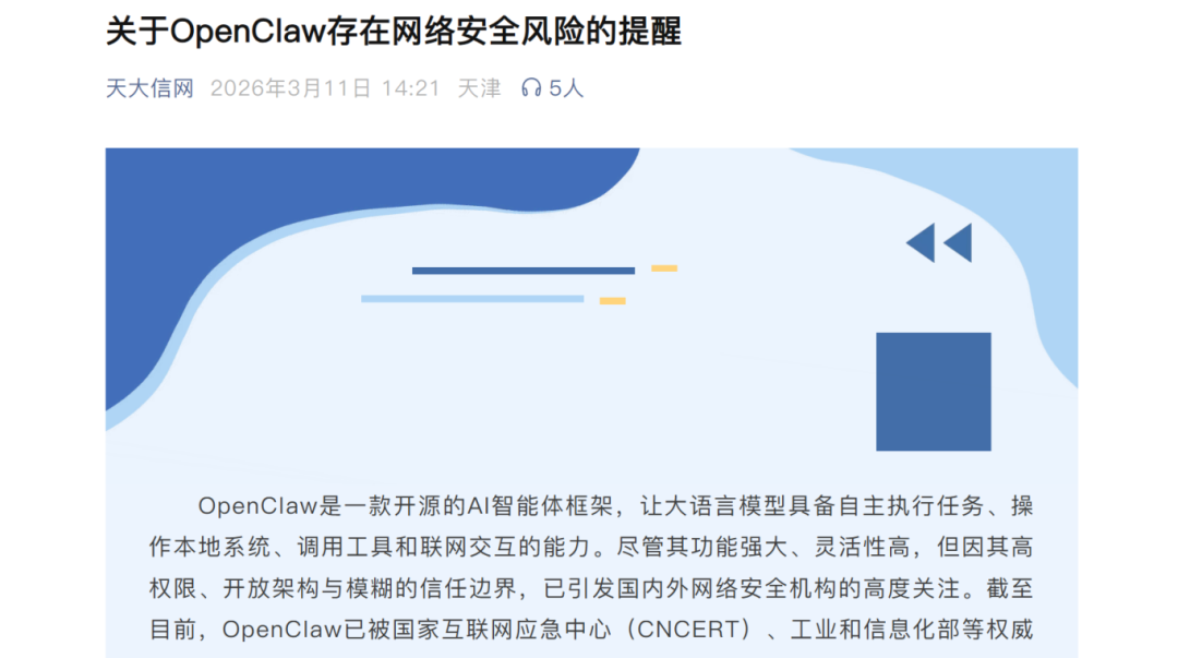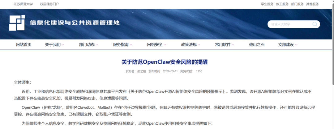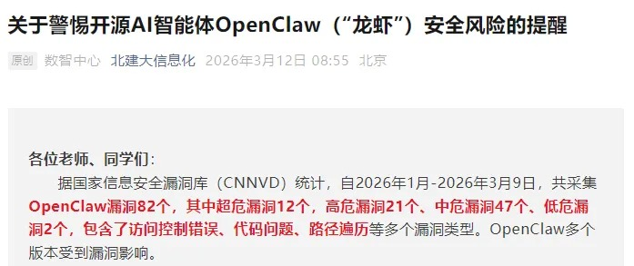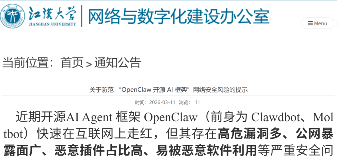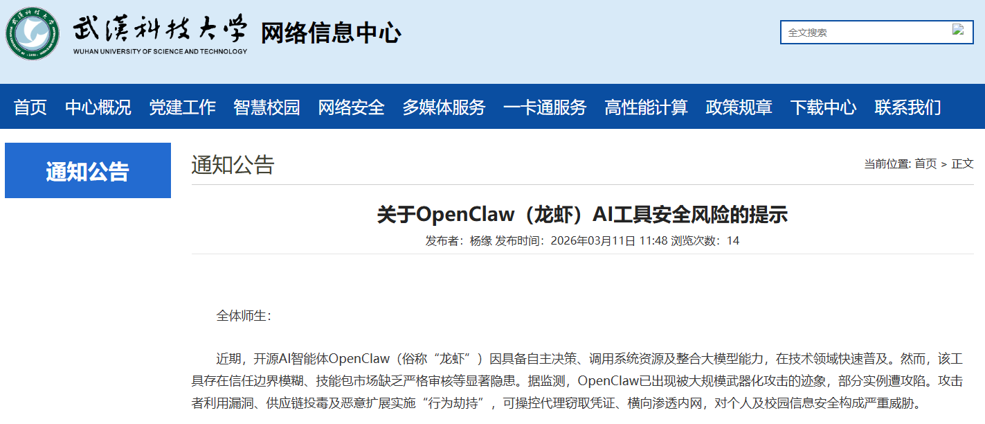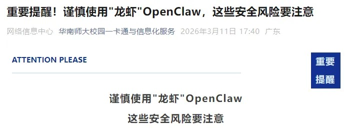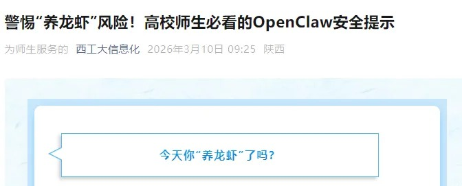 全校师生应结合自身实际需求理性看待该工具,切勿因跟风心理盲目安装、部署“龙虾”AI智能体,尤其避免在接入校园网的设备、办公电脑、存储有个人敏感信息和工作数据的设备上使用。