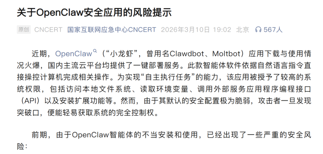 当前,OpenClaw(“小龙虾”,曾用名Clawdbot、Moltbot)应用下载与使用情况火爆,一股“养龙虾”的热潮正在兴起。3月10日,国家互联网应急中心CNCERT微信公众号发布《关于OpenClaw安全应用的风险提示》指出,前期,由于OpenClaw智能体的不当安装和使用,已经出现了一些严重的安全风险。